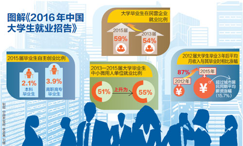 【核心数字】大学毕业生就业重心变化,民企、中小微企业、地级市及以下地区等成为主要就业去向。大学毕业生在民营企业就业的比例从2013届的54%上升到2015届的59%,与此同时,在国有企业就业的比例从2013届的22%下降到2015届的18%,在中外合资、外资、独资企业就业的比例从2013届的11%下降到2015届的9%。